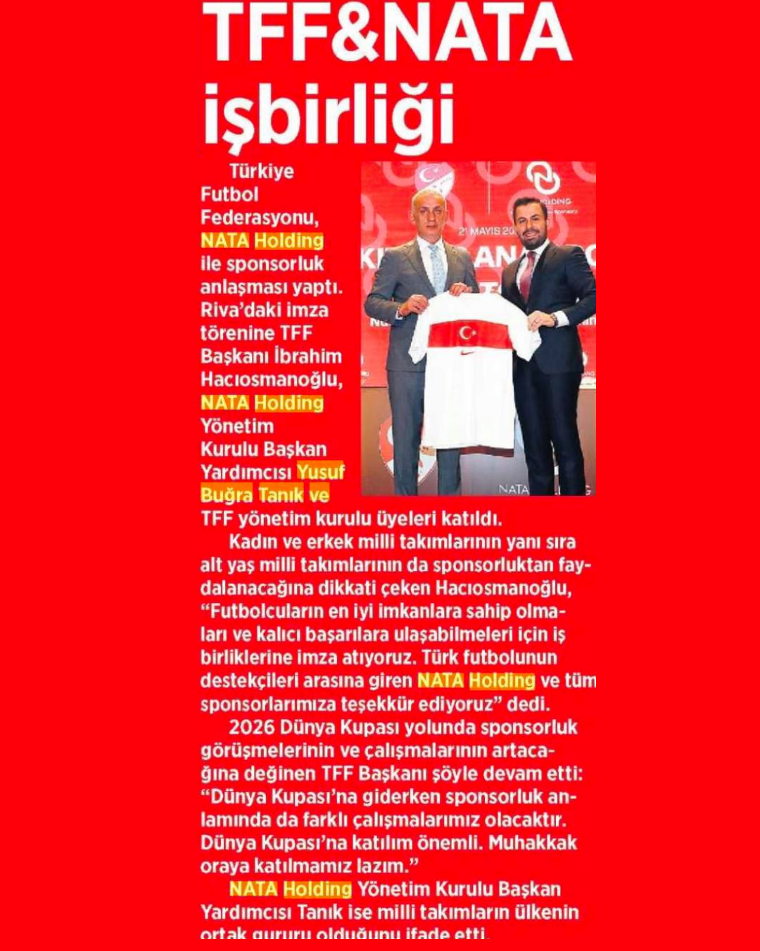 Nata Holding Millî Takımlar Ana Sponsoru Oldu